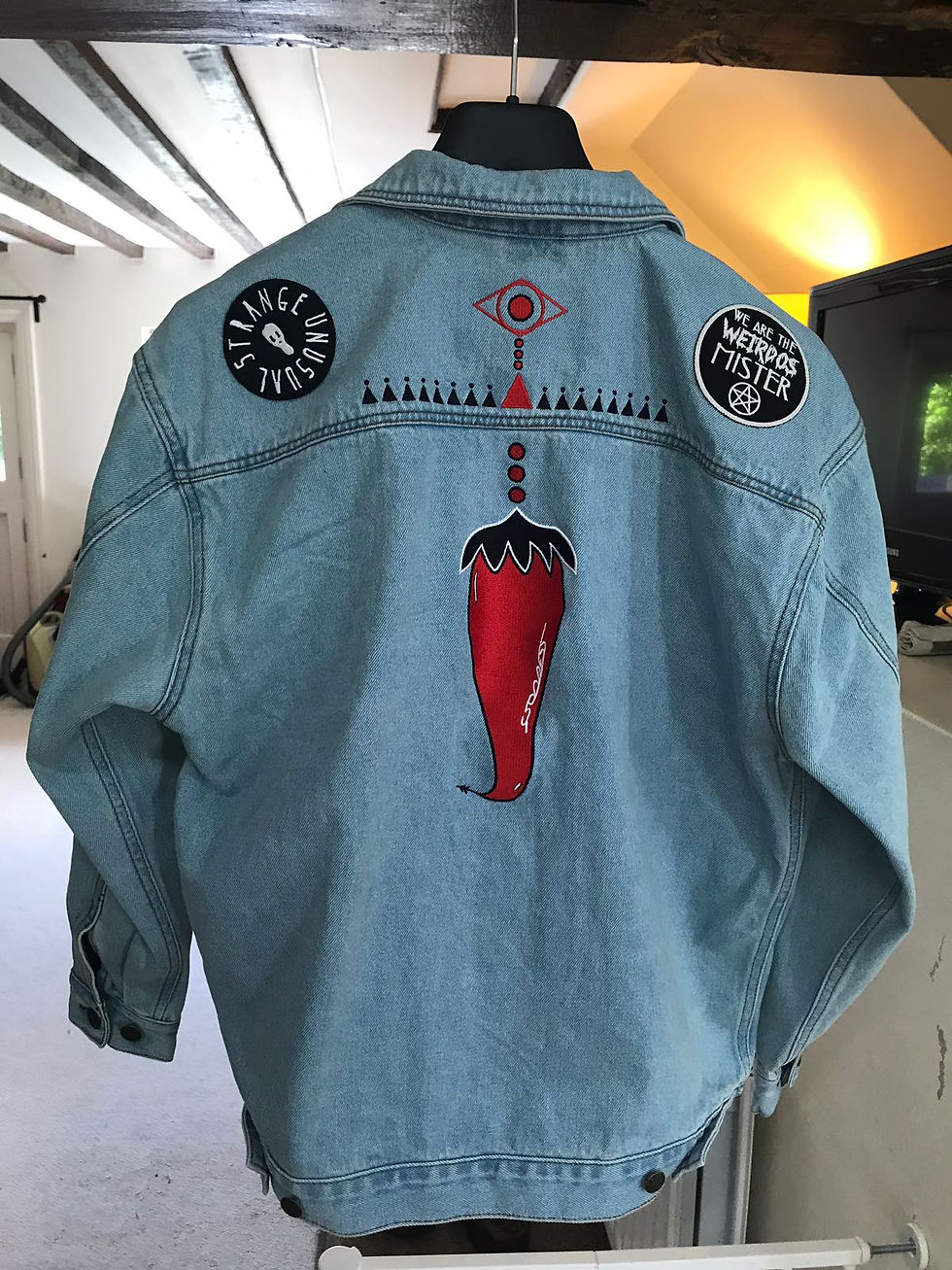 I have made two jackets for BANKS' birthdays. These are the processes from start to finish. One jacket, I hand painted and hand sewed the painting to the back. The other jacket, I devoted time and energy into designing each element to give it more symbolic meaning. This was then embroidered and I added my own lapel pins and badges.